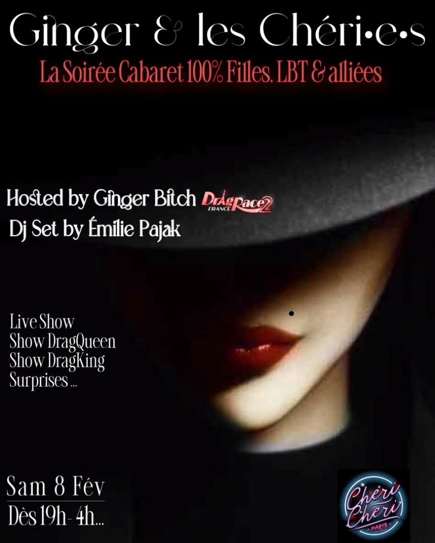 Rejoignez-nous pour une soirée inoubliable au cœur de Paris, au club Chéri Chéri, où la magie du cabaret rencontre l'énergie vibrante de la scène Queer Lesbienne! Ginger Bitch, reine emblématique de la saison 2 de Drag Race France, en Madame Loyale, vous accompagnera tout au long de cette nuit, dans une ambiance chaleureuse, mêlant humour, glamour et Amour!
