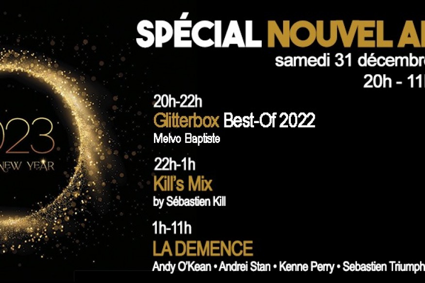G One vous proposera une soirée spéciale qui commencera par la sélection des titres de l'année par Melvo Baptiste dans l'émission Glitterbox Spéciale 2022. Puis de 22h à 1h, Sébastien Kills proposera une rétrospective des révélations de 2022. De 1h à 11h, G One proposera une programmation avec les plus grands DJs de LA DEMENCE : Andy O'Kean, Andrei Stan, Kenne Perry, Sebastien Triumph et Chris Bekker.