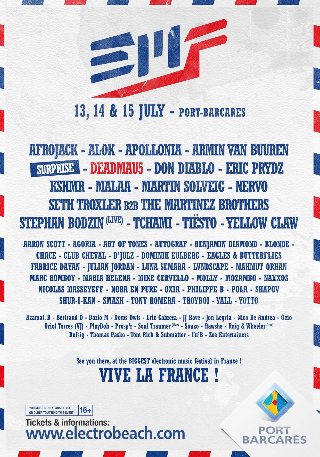 Durant 3 jours et sur 3 scènes, l'Electrobeach offrira à ses festivaliers un moment de partage et de fête inégalé sur la plage du Lydia, seul paquebot ensablé au monde, comme un appel à l'évasion. Depuis l'année dernière, le festival affirme son patriotisme et cette année encore, l'EMF, et son fameux slogan 'Vive la France', sera aux couleurs bleu, blanc, rouge, sur et en dehors de la scène.