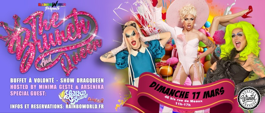 Le Brunch and Queen , le brunch le plus tucké de la capitale vous donne rendez-vous tous les dimanches au Wanted ! hosté par la sublime Minima Geste et la gorgeous Arsenika vous y retrouverez les Queens les plus démentes de la capitale et d'ailleurs tel que : Lolita Banana, Ginger Bitch, Misty Phoenix, MOON, Ruby Onthenail, Kitty Space..... qui se relaieront pour vous faire vivre un moment unique autour de notre buffet Italien XXL et à volonté comprenant un large choix de plats et desserts qui sauront vous séduire "vege friendly" ainsi qu'un buffet de boissons chaude et froide également à volonté.
