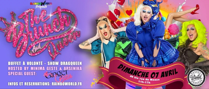 Le Brunch and Queen , le brunch le plus tucké de la capitale vous donne rendez-vous tous les dimanches au Wanted ! hosté par la sublime Minima Geste vous y retrouverez les Queens les plus démentes de la capitale et d'ailleurs tel que Arsenika, Lolita Banana, Ginger Bitch, Misty Phoenix..... qui se relaieront pour vous faire vivre un moment unique autour de notre buffet Italien XXL et à volonté comprenant un large choix de plats et desserts qui sauront vous séduire ainsi qu'un buffet de boissons chaude et froide également à volonté.