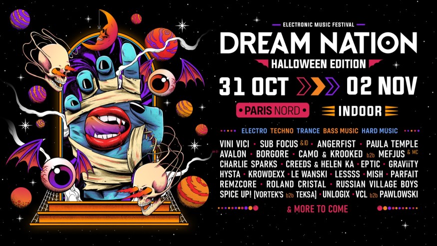 Du 31 octobre au 2 novembre, le Dream Nation transforme le Parc des Expositions Paris Nord pour la plus grosse soirée d'Halloween d'Europe avec un format indoor pouvant accueillir 45 000 personnes. La programmation musicale reste fidèle à son eclectsime en rassemblant les meilleures expressions de la musique électronique : Techno, Bass Music, Dubstep, Drum & Bass, Trance et Hard Music