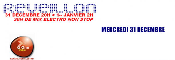 G One t'accompagne pour un reveillon spéciale, cette année c'est plus de 30h de Mix Electro Non Stop, et on te donne rendez vous dès 20h ce Mercredi 31 décembre.