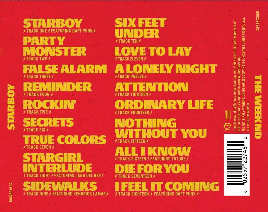 The Weeknd a posté hier le tracklisting de Starboy sur les réseaux sociaux :