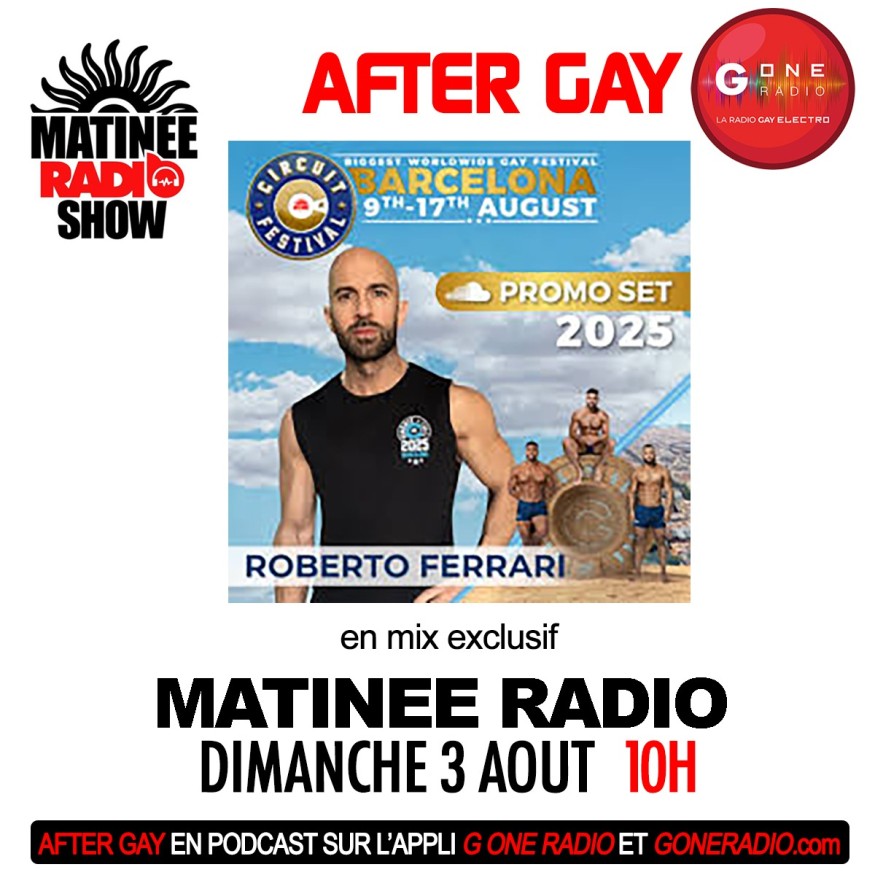 Réécoutez After Gay G One invite les soirées Matinée Group avec Roberto Ferrari du dimanche 3 août 2025.